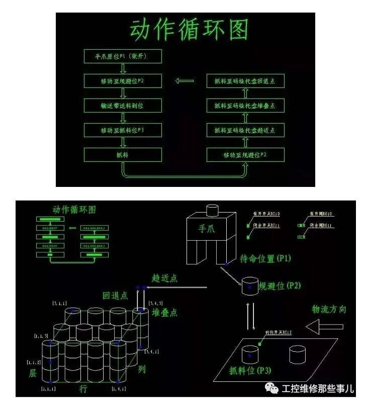 如下图所示动作循环,在输送带 P3 出进行工件抓取,在托盘上进行码垛。