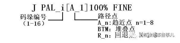 (1) 码垛指令格式:码垛指令基于码垛寄存器的值,根据堆叠模式计算当前的堆叠点位置,并根据路径模式计算当前的路径,改写码垛动作指令的位置数据。