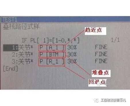 (2) 码垛动作指令:以使用具有趋近点、堆叠点、回退点的路径点作为位置数据的动作指令,是码垛专用的动作指令。该位置数据通过码垛指令每次都被改写。