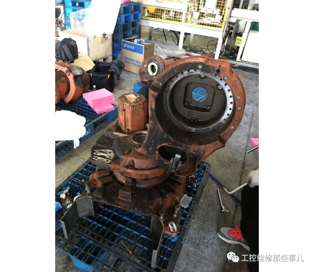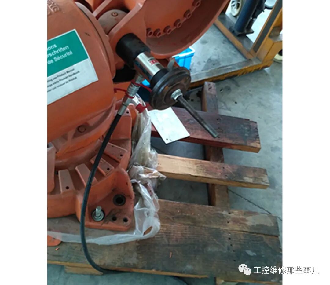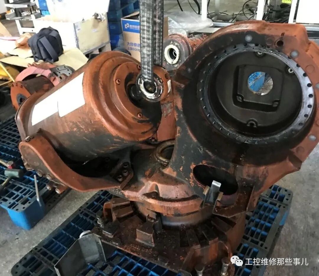 一.拆卸前,将机器人第二轴摇至接近零位,即第二轴电机齿轮箱上方的孔可以对准第二轴吊臂的螺纹孔,用吊车将机器人固定,如图所示。