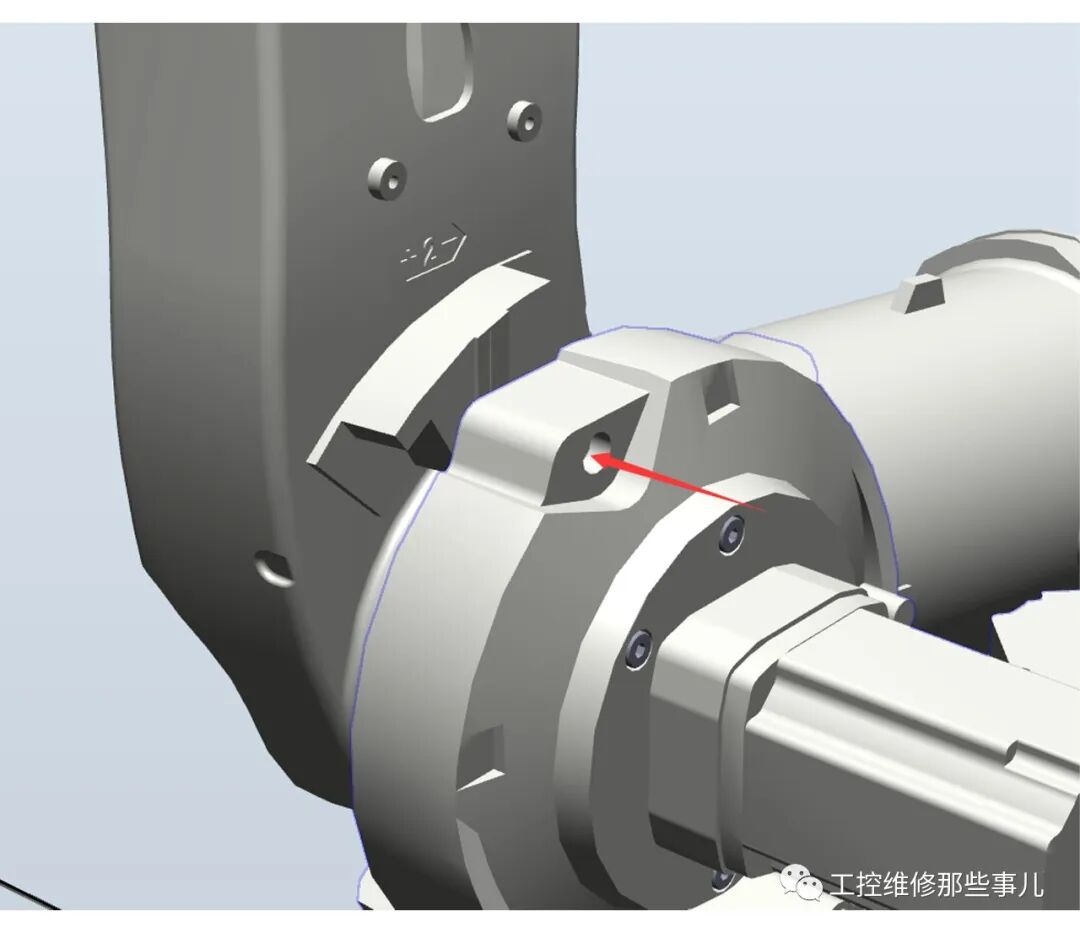 2.用螺钉将机器人双轴齿轮箱上端的孔位与机器人双轴臂上的孔位锁紧,防止平衡杆拆卸后倾倒,便于后续重新安装平衡杆,如图所示。